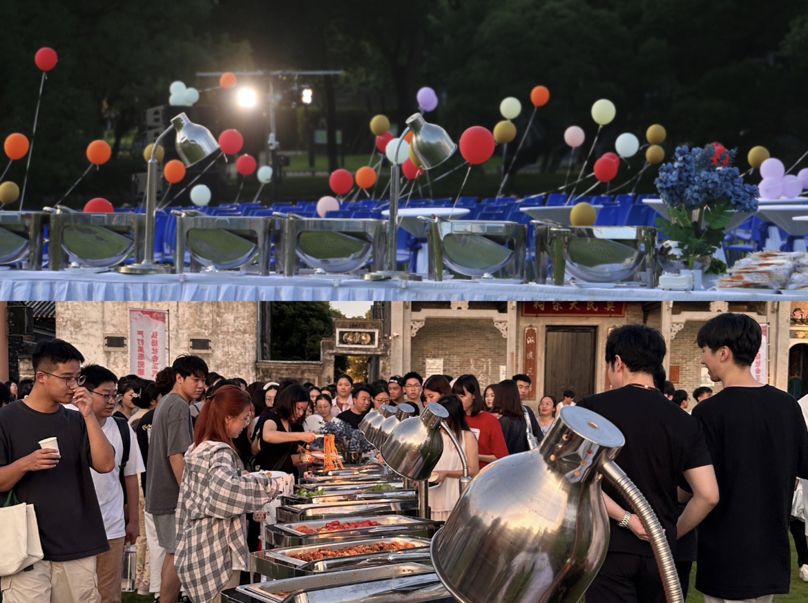 随着夜幕降临,自助餐晚宴在现场乐队美妙的音乐中拉开帷幕。同学们三五好友围坐一堂,享受美食佳肴。